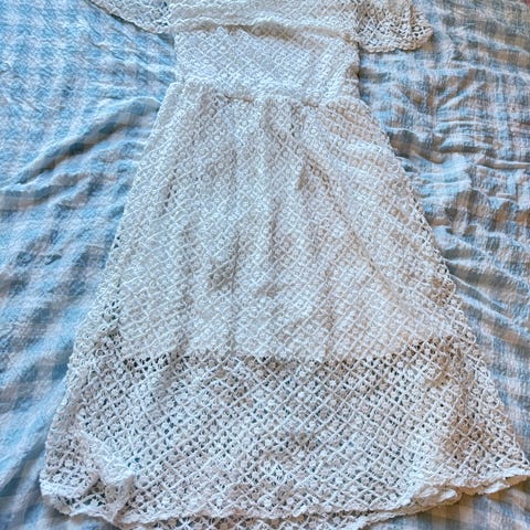 Smuk konfirmationskjole til piger i str. S/M. Kjolen er i en flot beige/hvid nuance med elegante blonder og mønster.
