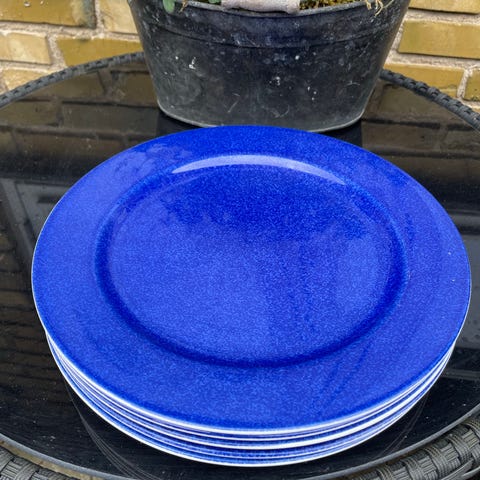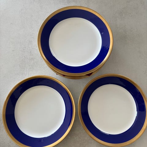 Rigtig fine Rörstrand middagstallerkener med blå kant. Mærket Rörstrand Sweden, P555. Måler 24 cm. i dia. Har få brugsspor i form af små mærker, jf. billeder, ingen skår eller afslag. En klassisk kvalitets tallerken. 15 stk haves. Prisen er pr. stk.