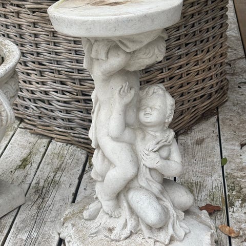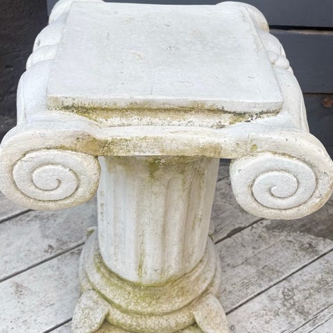 Super flot marmorsøjle der er 80 cm høj og 36 cm i dia for neden vejer 80 kg som netop kan bruges i haven ( er udenfor nu)som plante søjle mm da det er marmor IKKE gips får den flotteste patina udenfor hvor den også står nu. normal pris er over 1200 plus fragt mm