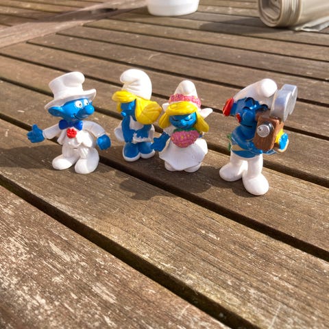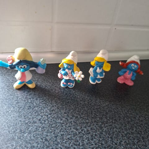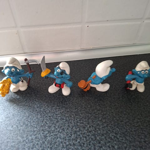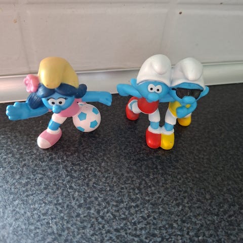 Smølfer figurer i blå og hvid plast. To små figurer, der forestiller smølfer med tilbehør i hænderne. Egnet som legetøj eller som samlerobjekter og dekoration på hylde eller skrivebord.