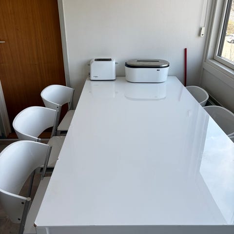 Hvidt rektangulært spisebord med hvide stole