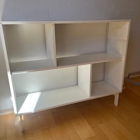 Hvid ABC Quadrant kommode med to skabsrum med låger, et uden og tre skuffer. Solidt træ bedømt ud fra vægten. Låger og beslag intakte. Mindre brugsspor. Står frit på en metalramme der er 12 cm høj.