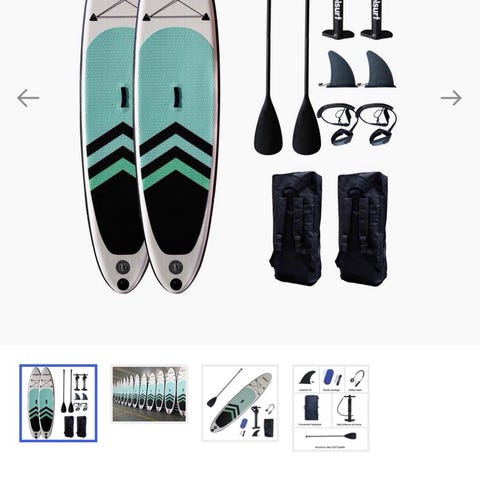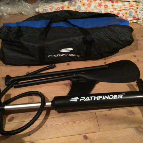 Retrospec oppusteligt SUP board i blå og lyserød farve. Sættet inkluderer justerbar pagaj i flere dele, håndpumpe med slange, aftagelige finner, sikkerhedsline, reparationssæt samt opbevarings- og transporttaske med skulderstropper. Boardet kan pakkes sammen og transporteres i den medfølgende taske.