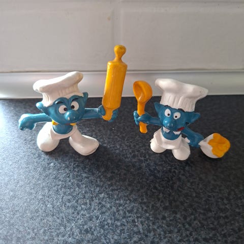 Smølfer små figurer sæt med 4 stk. Sættet består af fire forskellige smølfefigurer i blandede farver, primært blå, rød og hvid. Figurerne forestiller forskellige karakterer fra Smølferne-universet, blandt andet en figur med hjelm og spyd. Velegnet som samlerobjekter eller legetøjsfigurer til leg og udstilling.