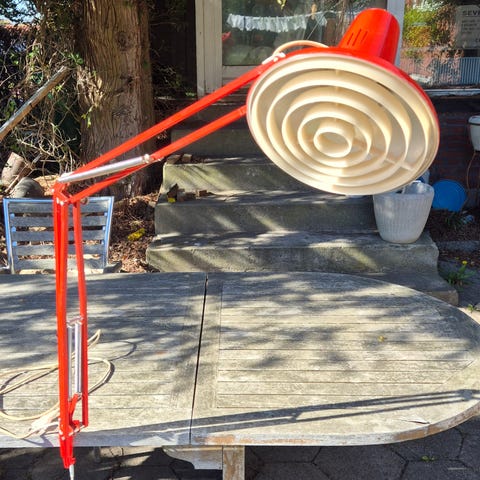 To små røde retrolamper fra Luxo, som er mest kendt for sine arkitektlamper. Her hedder dette design en parabolskærm.