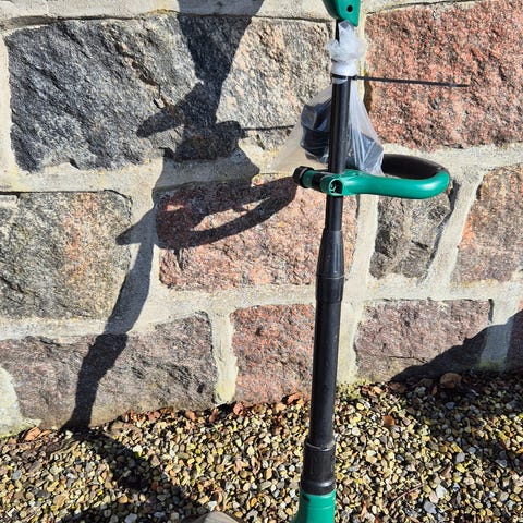 Black+Decker græstrimmer i orange og sort. Modellen har ergonomisk håndtag og teleskopstang, som kan justeres i længden. Egnet til trimning af græs og kanter i have og langs bede og stier. Strøm- eller batteritype fremgår ikke af billederne.