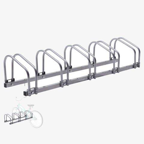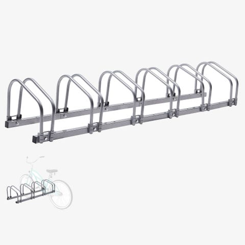 Vekso cykelstativ i metal i grå farve. Stativet er til at hænge cyklerne op med trekantede ben og kroge til ophæng af cykler langs den vandrette stang. Egnet til parkering og opbevaring af flere cykler på række, for eksempel i gård, garage eller ved bygning, hvor der er behov for organiseret cykelparkering. 3,5 m x 0.5 m x 0,5 m.