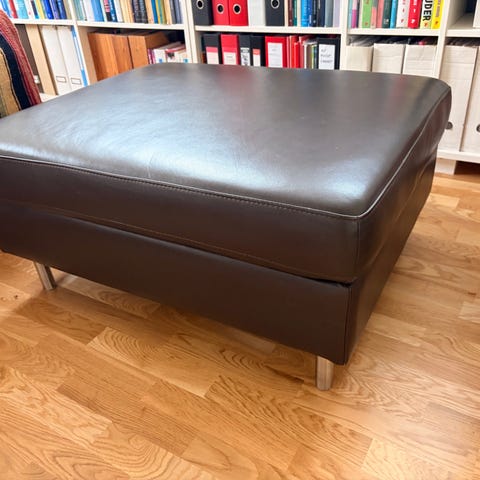 (Ikke fra boliga - mærket er ukendt) Puffen er i imiteret læder med stålben. Ingen tydelige tegn på brug - den er købt på loppemarked i Skagen, sommeren 2025. Kommer fra et røgfrit hjem. Byd gerne!