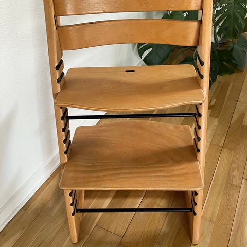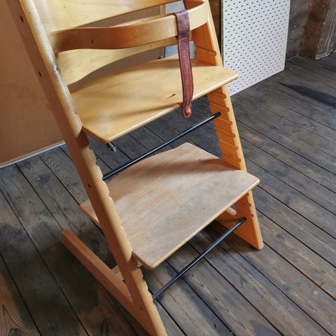 Stokke Tripp Trapp højstol i træ. Klassisk model med justerbar siddeplade og fodplade, der kan tilpasses barnets højde. Egnet som spise- og siddeplads til børn ved bordhøjde. Fremstillet i lakeret træ med synlige brugsspor på sædet.