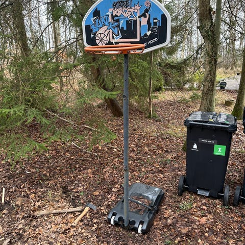 Basketball kurve på justerbart stativ, kirven trænger til et nyt net.