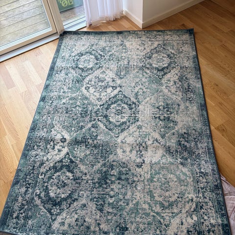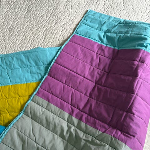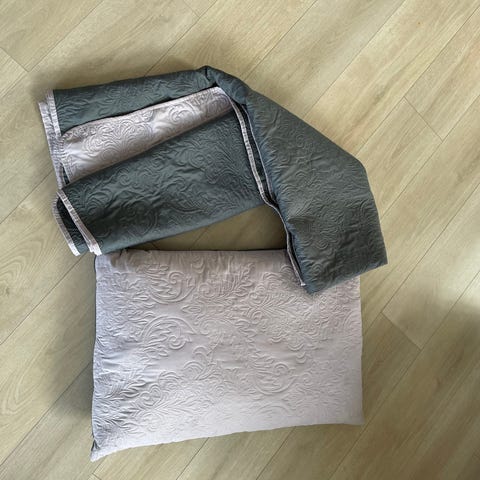 IKEA Mjukplister tæppe i mørk blå farve. Tæppet har quiltet mønster med synlige ruder og en glat bagside. Det kan anvendes som sengetæppe, plaid eller ekstra lag på sengen.