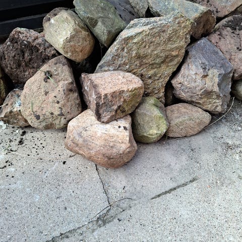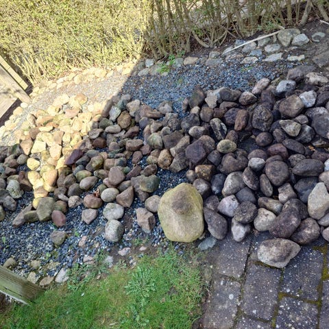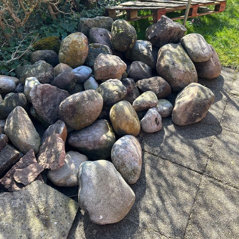 50 m2 marksten / natursten / pigsten i gns diameter på 10-15 cm gives væk. Afhentning søndag 12/4.