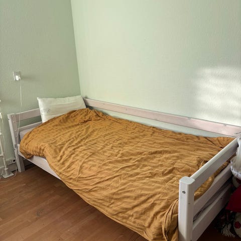 Flexa seng købt hos Ilva med lamelbund i hvidt træ. Sengen har en enkel ramme med afrundede gavle og ben i naturtræ. Lamelbunden består af trælameller, der giver støtte til madrassen. Velegnet som enkeltseng, fx til børneværelse eller gæsteværelse. Madrassen og topmadrasse følger med 90x200 cm.