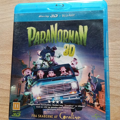 ParaNorman 3D Blu-ray film. Udgave med både Blu-ray 3D og almindelig Blu-ray på 2 disc. Animeret spillefilm med dansk tekst og taleangivelser på omslaget. Egnet til afspilning på Blu-ray-afspillere, herunder 3D-kompatible systemer. Aldersmærket 11 år.