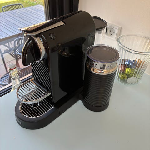 Nespresso espressomaskine med tilhørende elektrisk mælkeskummer i sort. Maskinen anvender Nespresso-kapsler og har aftagelig vandtank bagpå. Drypbakken foran kan tages af for nem rengøring. Mælkeskummeren står separat ved siden af maskinen og tilsluttes med ledning. Velegnet til tilberedning af espresso, lungo og kaffedrikke med mælk som cappuccino og latte.