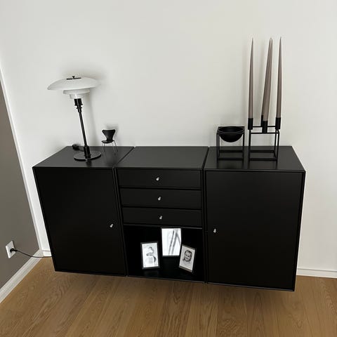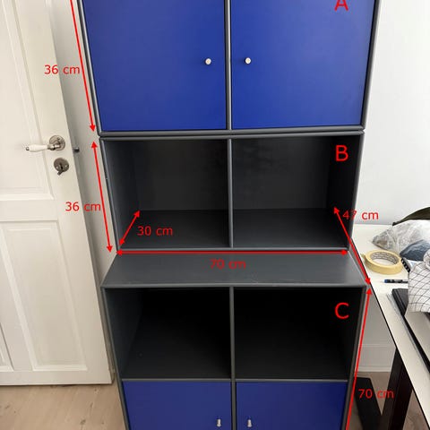 Billederne viser de 9 moduler i deres nuværende opsætning: en reolvæg med 2x3 og en reolvæg med 3x1 moduler.