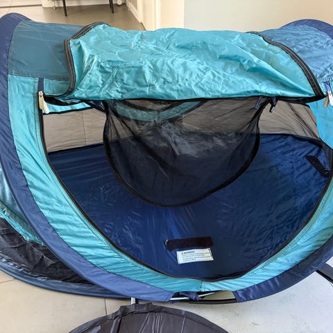 Genial rejseseng der folder ud som et pop-uptelt med et selvoppusteligt liggeunderlag til.