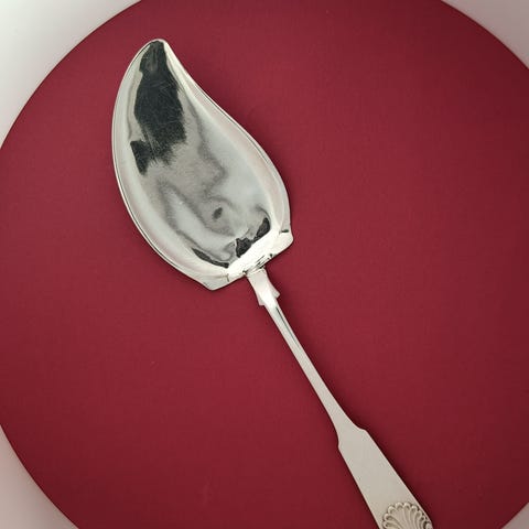 Musling sauceskeen er i pæn stand, dog er der naturlige brugsspor i form af ridser, og nogle bittesmå prikker/fordybninger i "skålen". Det ses ikke, når skeen er i brug.