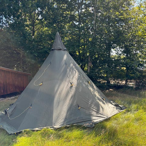Sprit nyt letvægts telt fra øvertste hylde, kun opstillet en gang indendørs. Bliver desværre for lille til mit behov. Ekstra bund (footprint) medfølger.