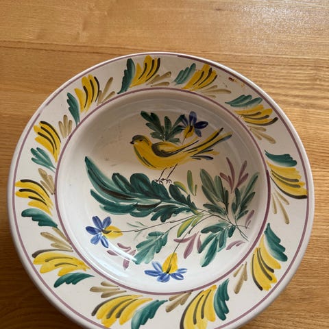 Keramisk skål med håndmalet dekoration i blå og gul. Skålen har en lys bund med blå cirkulære striber og motiv af gule frugter eller blomster med blå blade i midten. Indersiden er domineret af blå nuancer langs kanten, mens ydersiden fremstår lys med enkelte blå detaljer. Velegnet som serveringsskål eller dekorationsskål i køkken eller stue.
