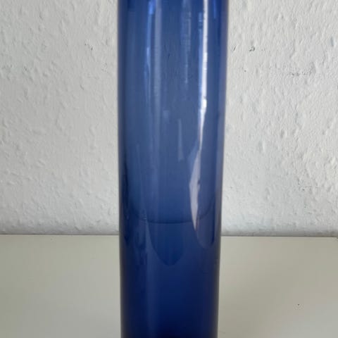 Blå glasvase designet af Per Lütken for Holmegaard i 1950'erne eller 1960'erne. Højde 28 cm og diameter 7,5cm. Meget lille brugsridser nær bunden ellers fin stand.