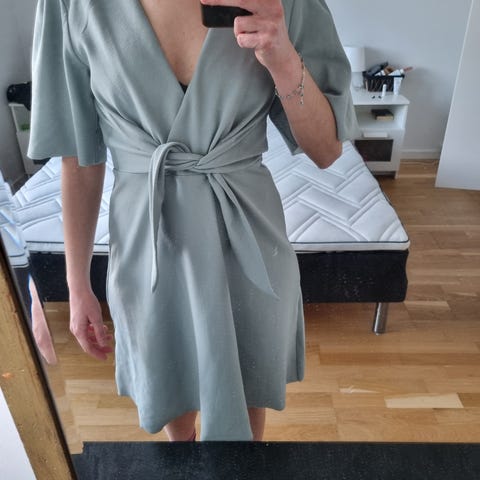 Kjole til særlige lejligheder i størrelse M til kvinder. Kjolen er fremstillet i polyester og er rosa. Designet har plisseret overdel med kort ærme og krydsdetalje foran. Nederdelen er lagdelt med let rynkeeffekt. Der er fastsyet et smalt bælte i taljen, som markerer faconen. Egnet til festlige og formelle anledninger.