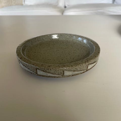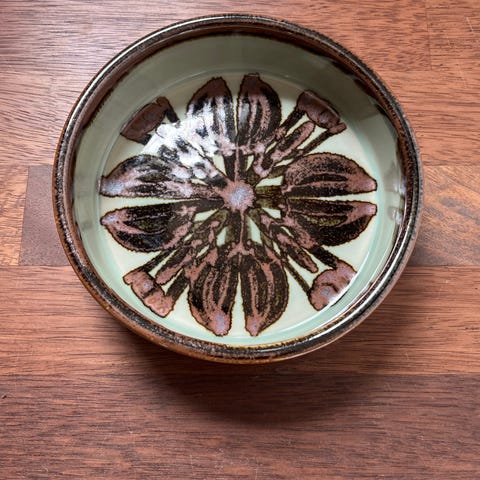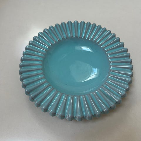 Keramikskåle i to farver: en grøn og to blå. Alle 3 har en markeret, segmenteret kant og glaseret overflade. Undersiden er glaseret i samme farve som oversiden og har en lille fodring.