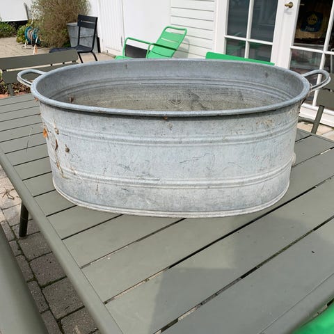Zink balje i oval form og grå farve. Baljen har rust indvendigt men er egnet til dekoration, plantebalje eller opbevaring udendørs eller i have- og gårdmiljøer. Materiale: galvaniseret metal/zink. Ingen mærkeangivelse.