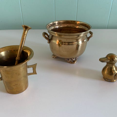 Messing / bronze figur ar vaskebalje og gruekedel / saltkar / messingfigur