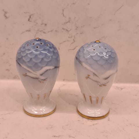 Porcelæn salt- og pebersæt i hvid med blå dekoration. Sættet består af to shakere, hvor den ene er markeret med teksten "Salt" og begge har blå motivdekoration. Velegnet til brug på spisebordet til opbevaring og dosering af salt og peber.