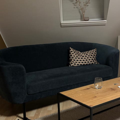 I fin stand, men med brugsspor. Lidt småmærker på stoffet og fnuller i siderne, specielt forkanterne.