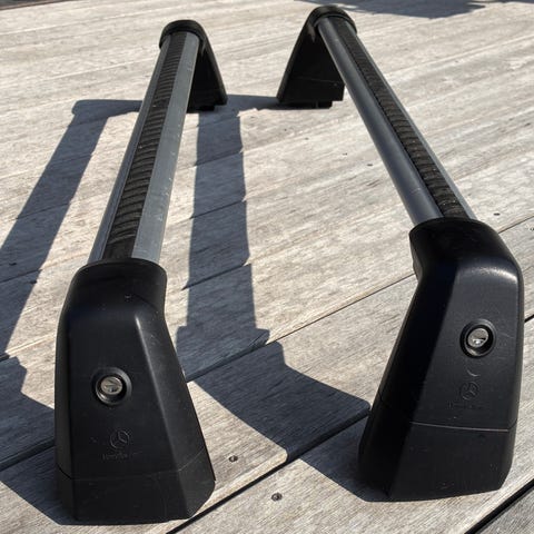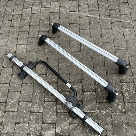 Til montering på tag, til 3 cykler. Thule tagbøjler passer til Mercedes E200 2014, eller andre biler med åben tagræling.