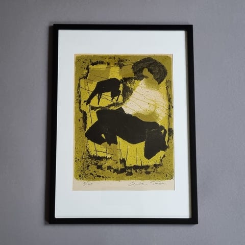 Signeret og nummereret litografi med abstrakt figurativt motiv. Værket viser en kombination af ansigtsportræt og dynamiske, skitseagtige linjer i sorte og blå nuancer på lys baggrund. Nederst ses nummerering 250/300 samt kunstnerens signatur med blyant i margen. Trykt på kraftigt papir egnet til indramning.