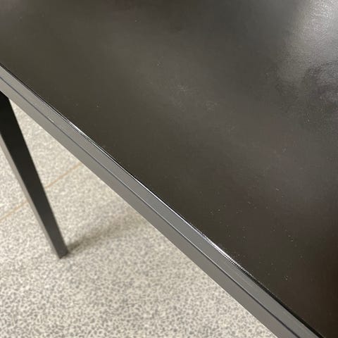 Dejligt stort spisebord med Nero (sort) Forbo linoleum, HAY stel/ben og ekstra ben. Bordpladen er 30 mm tyk og har linoleum på alle flader og kanter. Giver god akustik og er nemt at holde rent. Uden ridser og brændmærker. Gøres rent med brun sæbe. Ben kan afmonteres ved transport. (sælges uden Y stole)