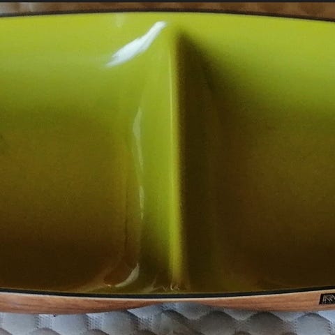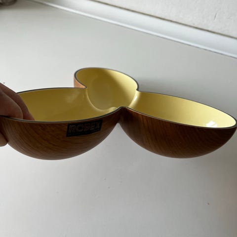Roblex serveringsfad med fire sammenhængende skåle i grøn inderside og trælook på ydersiden. Velegnet til servering af snacks, tilbehør eller småretter på bordet. Skålene er runde og fast forbundet i én lang række, så fadet er let at flytte og placere på bordet.