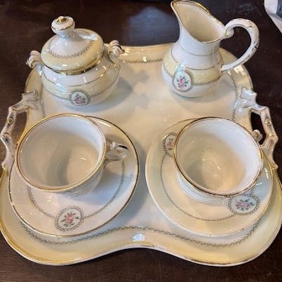 Tekande 5 kopper og div tallerkner, sukkerdkål, mælkekande og fade samlet kr 1000