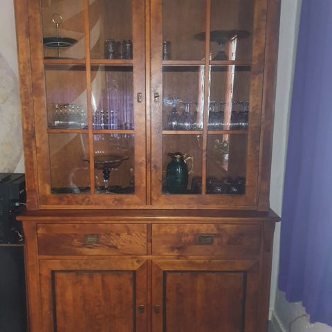Der er enkelte ridser på midterpartiets nederste hylde mens resten af træet i alle tre skabspartier er i fineste stand.