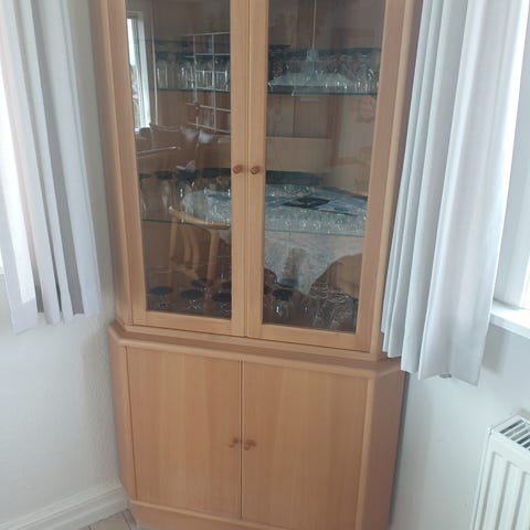 Fint lille hjørneskab, med glaslåge, ligne det er mahogni, måske finer.