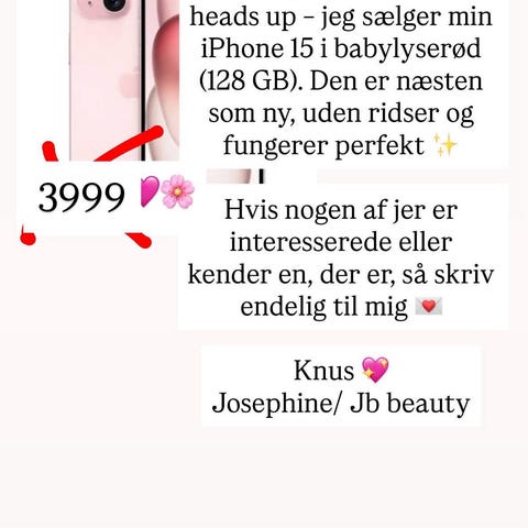 Jeg søger (til min datter) en iPhone 15 i farven lyserød. Den skal være i god stand. Jeg afhenter på Fyn.