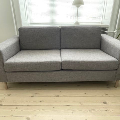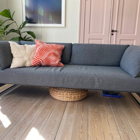 Rød sofa. Har en del år på bagen, men er stadig solid og god.