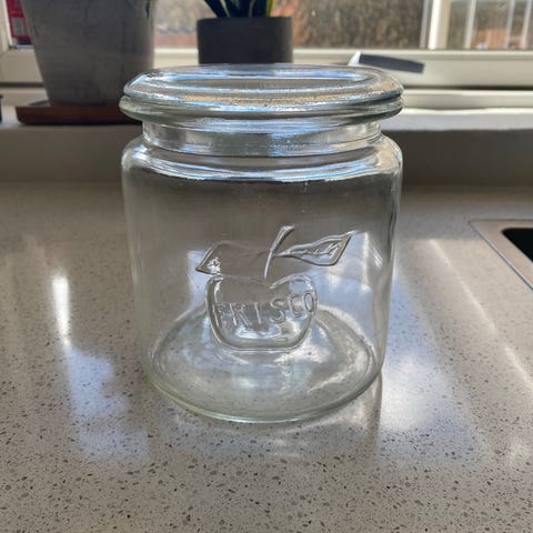 Frisco henkogningsglas med tilhørende glaslåg. Cylindrisk form, egnet til opbevaring i køkkenet, for eksempel tørvarer eller syltning. Lågene er ligeledes i glas og passer til beholderne, så de kan stables eller stå med bunden i vejret som på billederne. Velegnet som praktiske opbevaringsglas i hjemmet.