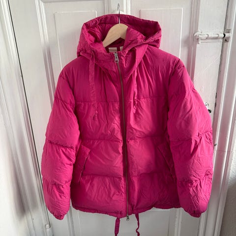 Med hætte og to front lommer, og snøre forneden af jakken, som kan strammes ind.