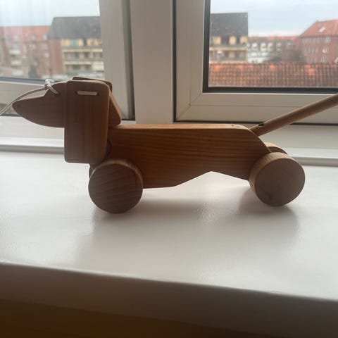 Træhund i naturtræ med bevægelige ben og hoved. Figuren er udført i lyst træ med mørke, bløde ører og en hale i snor/læder.