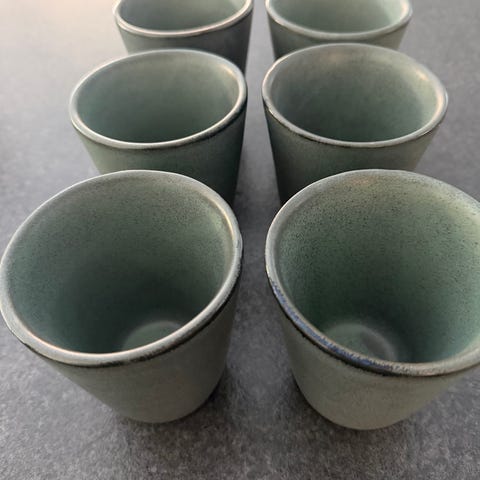 Kopper, sæt m. 4 stk. Porcelæn m. lys grøn glasur og kinesiske tegn i blå. Højde 7,5 cm, dia. øverst 7 cm.