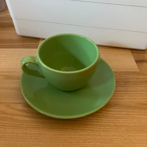 Kopper, sæt m. 4 stk, grøn porcelæn med blå skrift.