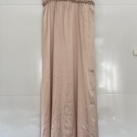 Farverig maxikjole med lange ærmer med smock syning nederst. Gennemknappet med skjult knaplukning. Underdel del i 2 "flæser". Længde midtbag 126 cm, fra hals til midtsyning "talje" 40 cm, taljen 45 cm. Krøller meget lidt. Købt for 495 dkk