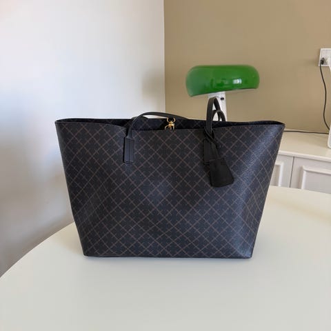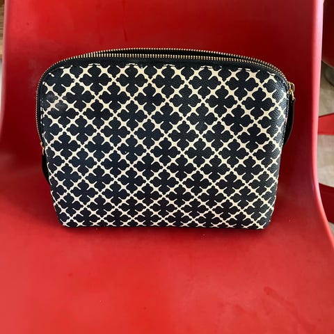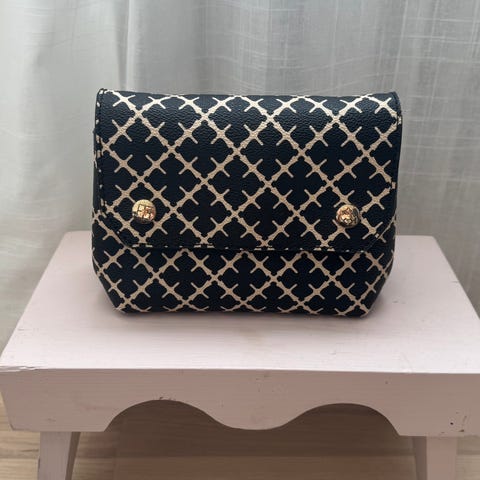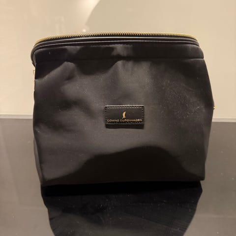 Tasken er rektangulær med håndtag øverst og lynlåslukning hele vejen rundt. Ydersiden er mørk med karakteristisk By Malene Birger-mønster og metallynlås. Indvendigt er tasken foret i lys tekstil og har flere rum, herunder lynlåslomme og elastiske lommer til organisering af indhold. Velegnet som toilettaske, kosmetiktaske eller mindre opbevaringstaske.