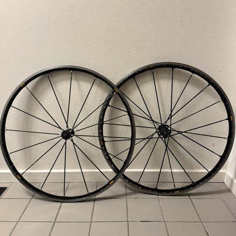 Mavic Aksium Race hjulsæt, 700c. Meget pæn stand og stadig rigtig meget gods tilbage på bremseflangerne. Vægt kun 1900 gram. Alufælge. Lukkede lejer, der ruller perfekt uden slør. Fælgene står snorlige, for spændt op 20 aero egre radialt, bag med 10 aero egre i 2 x kryds i drivsiden og 10 aero egre i radial opspænding i venstre side. Friløb er til Shimano/Sram og tager op til 10-speed. Friløbet klikker fint og går i indgreb med det samme. Originale QR/hurtigbespændinger er inkluderet.