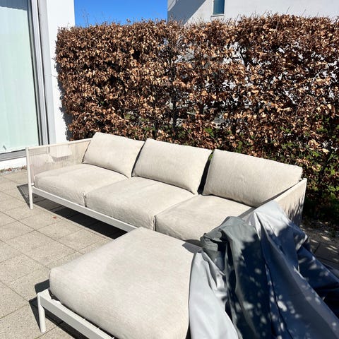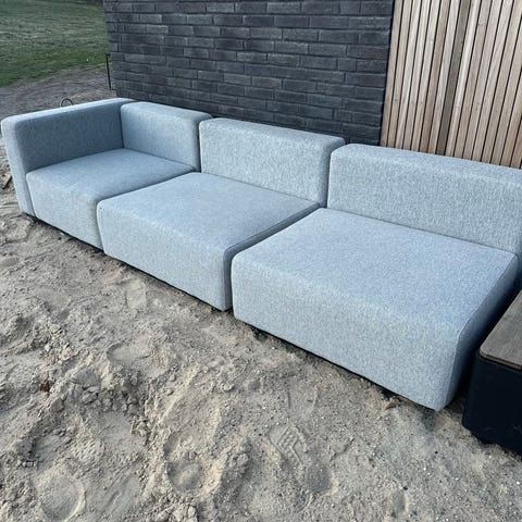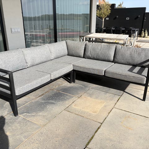 Sofagruppe i form af en større hjørnesofa i gråt stof. Sofaen består af flere moduler, som er sat sammen til en vinkelopstilling. Den har polstrede sæder og ryglæn samt armlæn i den ene ende. Velegnet som loungemøbel, f.eks. til stue eller overdækket terrasse, hvor der er behov for flere siddepladser.