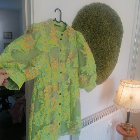 Bruuns Bazaar sommerkjole til kvinder. Der står ingen størrelse i, men gætter på en L. Kig på de sidste billeder for mål. Kjolen er sortmønstret med et grafisk print i sort og lys nuance. Den har lange ærmer med elastik ved håndleddene og en løs, let faldende pasform med skæring i taljen. Materialet fremstår let og tyndt, egnet til brug i forår og sommer eller med lag under. Velegnet til hverdagsbrug eller mere pæne anledninger afhængigt af styling 🖤🤍
